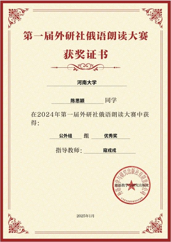 近日,由外语教学与研究出版社主办的首届全国俄语朗读大赛落幕。21点规则 学子表现优异,2023级播音与主持艺术专业姚兆林、王佳悦两位同学分获公外组二等奖,陈嘉颖获优秀奖,我校获颁“优秀组织奖”荣誉称号。