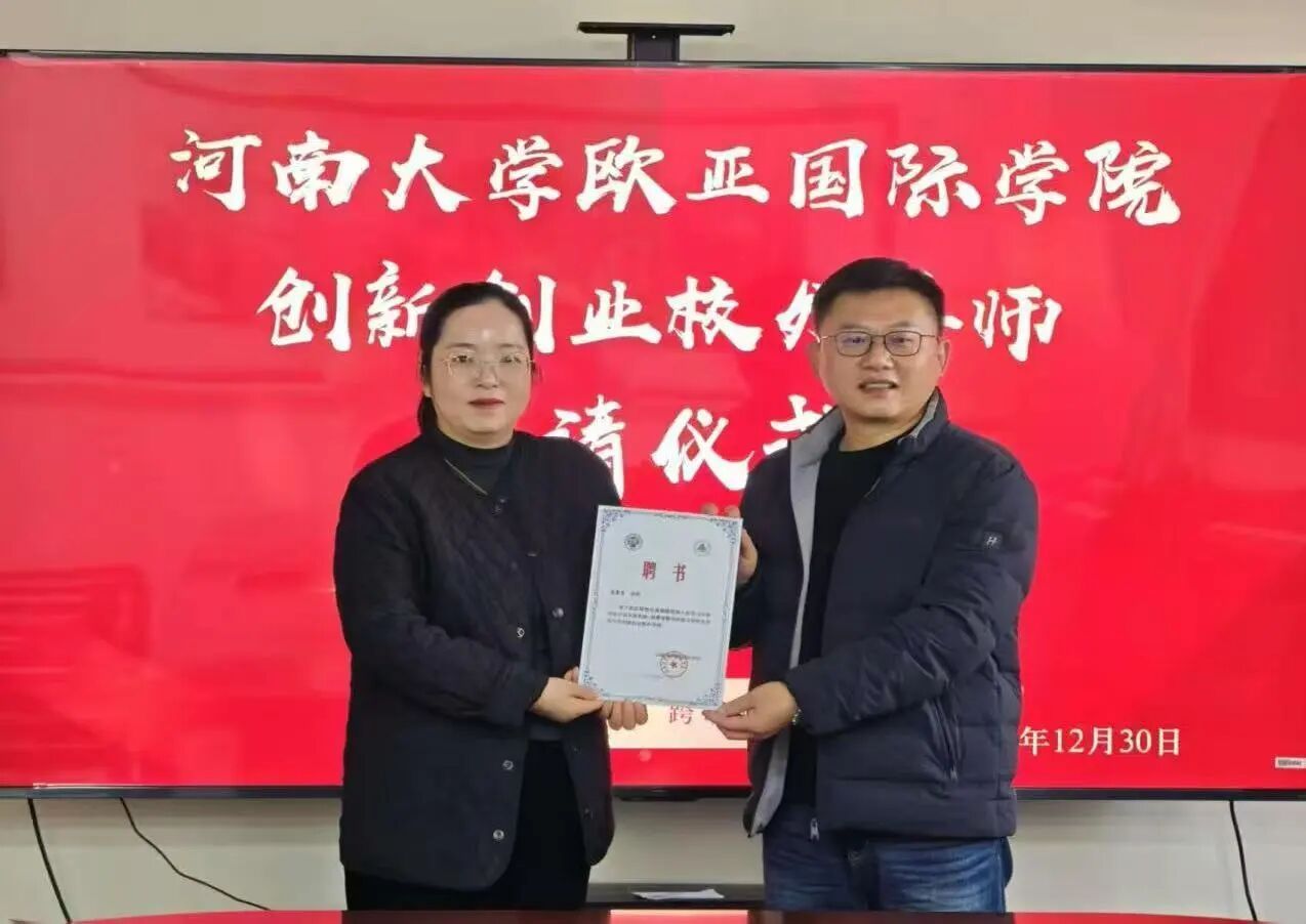 2025年12月30日上午,21点规则 在院309会议室举行创新创业校外导师聘请仪式,正式聘任我校校友、寰球驾士(深圳)国际仓储物流有限公司创始人赵凯杰为学院创新创业校外导师。仪式现场,学院党委副书记贺颖为赵凯杰颁发聘书,双方就校企合作、学生实践培养等方面进行了交流。