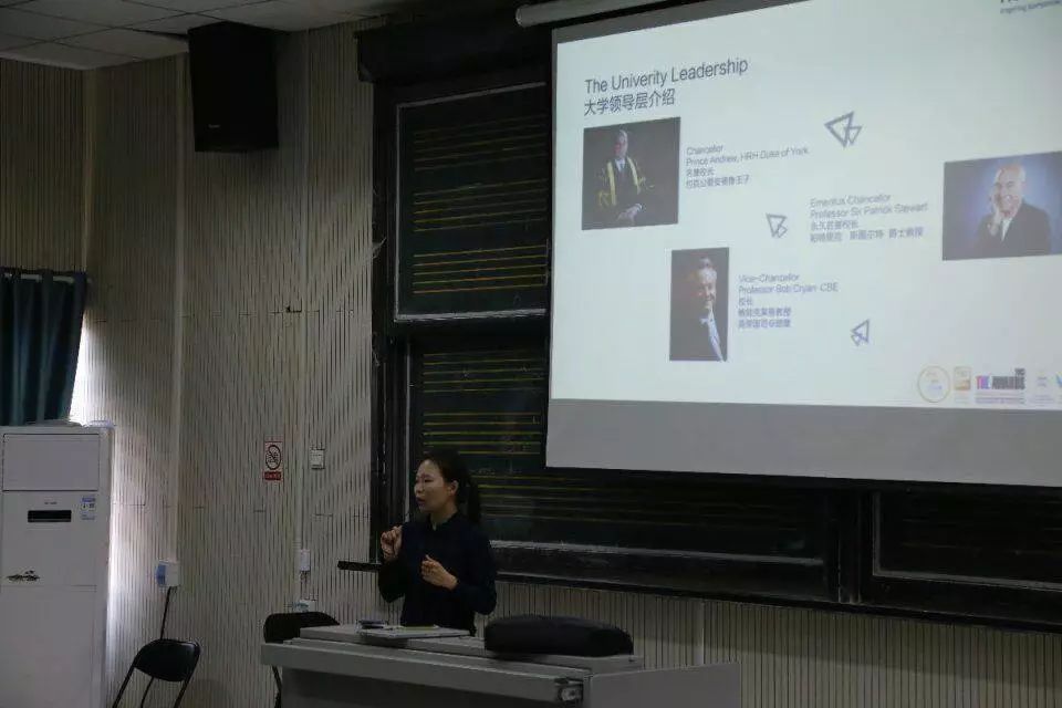在正式开始之前,哈德斯菲尔德大学华北区市场官员王唯依老师询问了同学们对于留学方面的疑问,并为同学们详细地介绍了英国学制与中国学制的不同,为同学们介绍了学生较为关心的在英国生活费用的问题,并简单说明了在英国哈德斯菲尔德大学的衣食住行等方面的问题。在回答完学生的问题后,王老师正式开始介绍哈德斯菲尔德大学的相关情况。