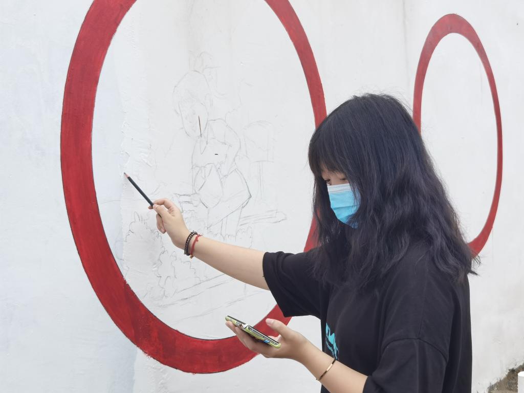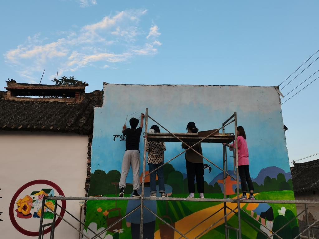 一支支画笔在咫尺之间描绘出动人图画,缤纷五彩的颜料泼洒出乡村的百味人生。队员们积极考察刘村文化特色,结合建党百年红色文化以及自身所学创作墙绘,在承载乡村记忆的基础上,展现出了崭新、活泼的一面。一面面朴素的白墙通过队员们的巧妙设计,瞬间“活”了起来,仿佛披上色彩艳丽的“外衣”,赏心悦目。从调色到刷漆上色,再到细节刻画和最后收尾,队员们协调配合,严谨认真,用笔尖描绘出新农村的新风貌,用艺术激发出乡村的内生动力,为刘村旧貌焕新颜献出自己的力量。