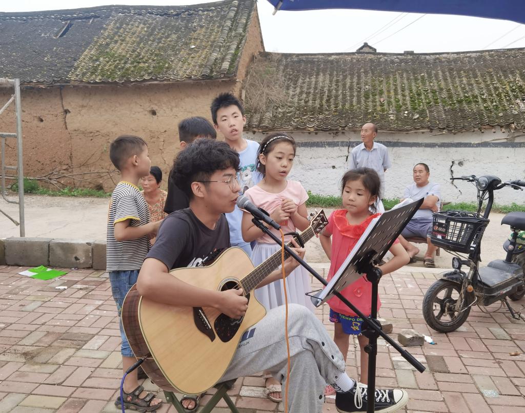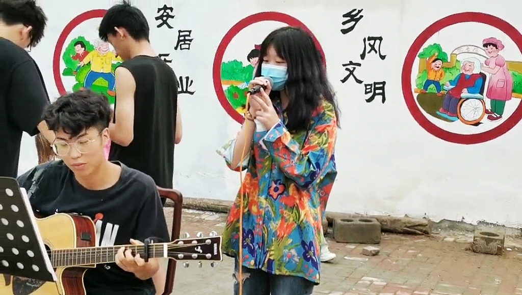 除了进行墙绘,队员们还致力于培育乡风文化,将人民群众喜闻乐见的文艺节目送下乡。嗓音低沉有磁性,歌声婉转悠扬,一首极富生活气息的《依兰爱情故事》更是受到乡亲们的喜爱与掌声。文艺小队还结合当地人民群众的文化生活需求和民族文化特色,创造性地将民族乐器和红歌演唱灵活结合,优美动听的旋律在小乡村中久久萦绕,用艺术的感染力和影响力,奏响新时代共建美丽乡村交响曲,为刘村文化振兴工作贡献青春力量。