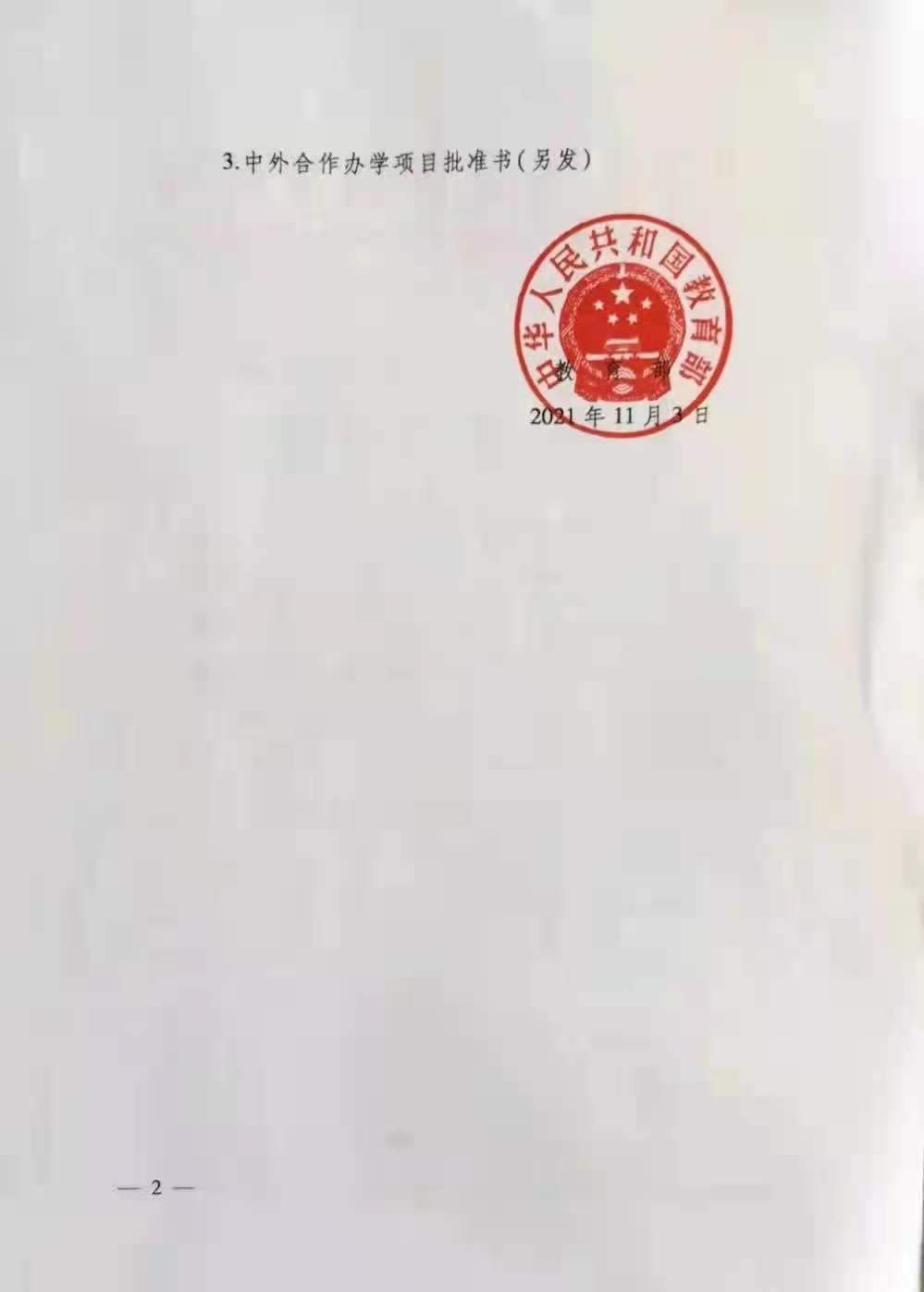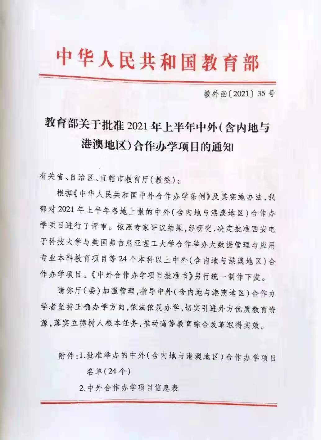 中外合作办学信息平台《教育部关于批准2021年上半年中外合作办学项目的通知》。