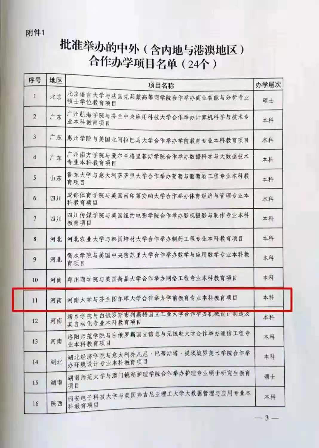 11月3日,教育部发布了《教育部关于批准2021年上半年中外合作办学项目的通知》,决定批准24个本科以上中外合作办学项目。河南大学与芬兰图尔库大学合作举办学前教育专业本科教育项目获得教育部审批。该项目是我校21点规则 继播音与主持艺术、视觉传达设计、环境设计和俄语专业之后的第五个教育部中外合作办学项目,项目计划从2022年起开始招生。