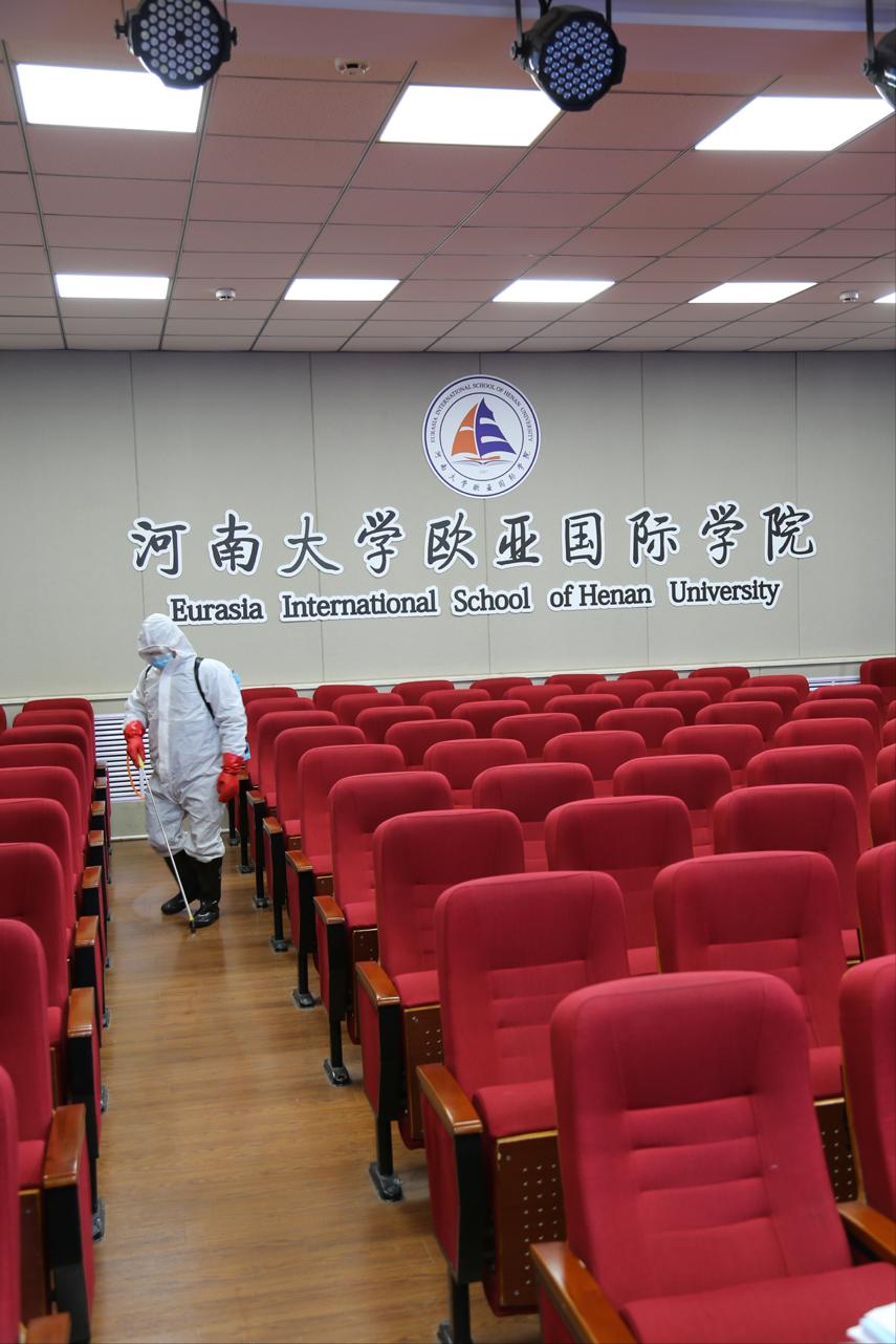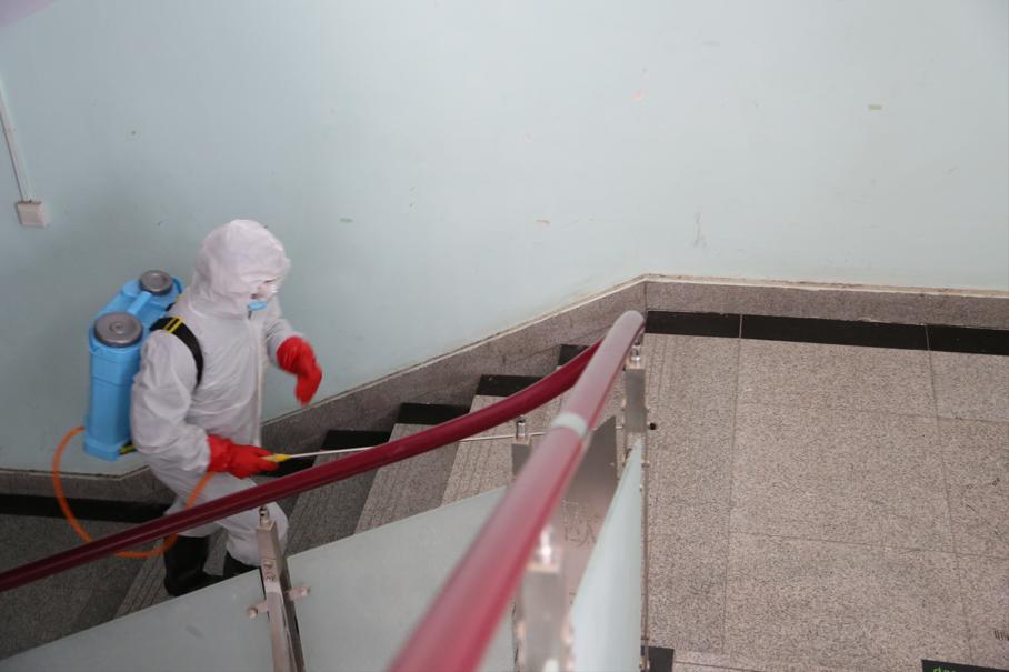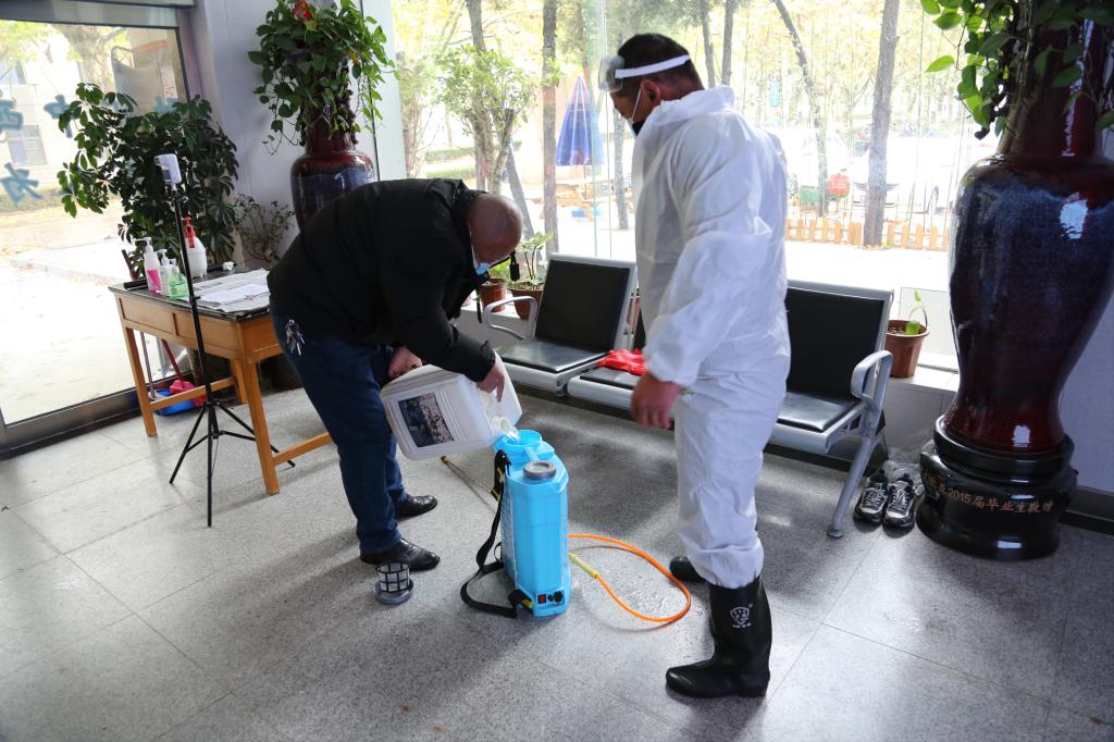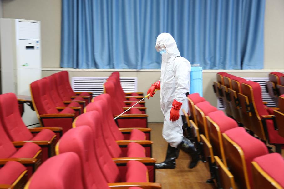 防疫人员对二楼报告厅进行细致入微的消毒工作