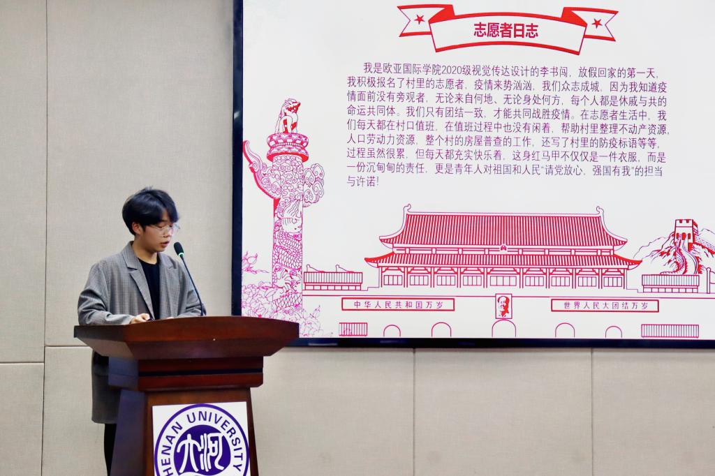 寒假以来,欧亚学子积极投身于家乡的疫情防控工作,成为一名名抗疫服务志愿者,他们将青春赋予志愿奉献之中,坚守岗位、认真负责,为抗击疫情贡献出了自己的一份份力量。本次“思政第一课”即是由参与了志愿活动的同学们向大家分享自己在寒假期间的服务心得和体会。