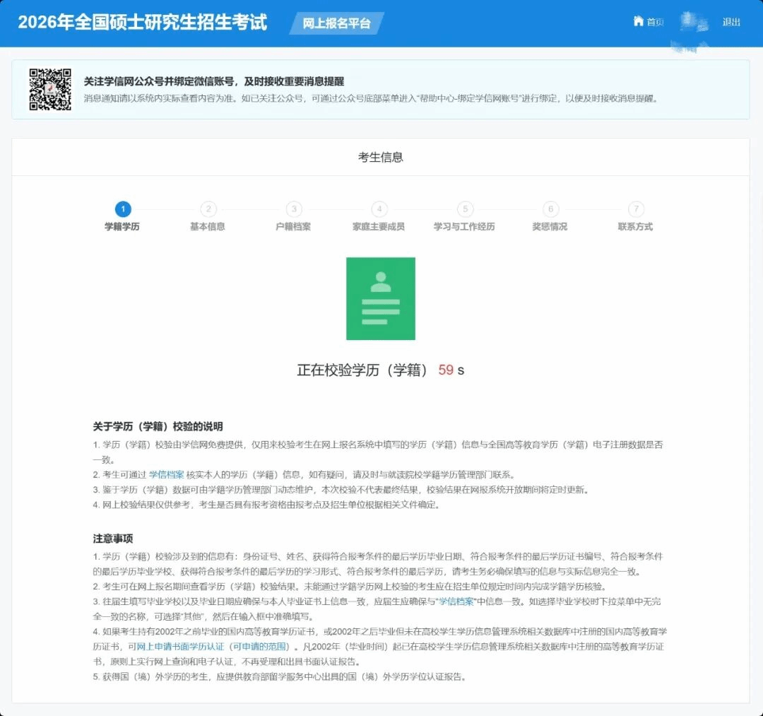 一般情况下,学历(学籍)信息是可以快速校验的。如遇网络拥堵等特殊情况,可能会出现“学历(学籍)校验进行中”的状态,这不会影响接下来的操作,考生可以继续填写考生信息中的其他部分。